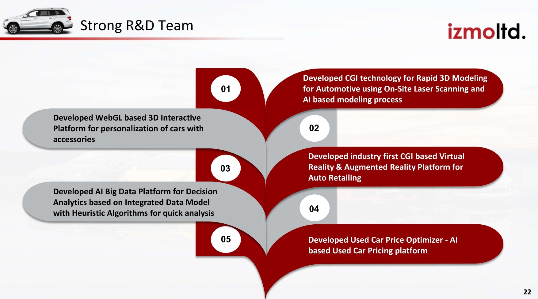 The R&D (Research and Development) team at Izmo has made some impressive achievements, including:
