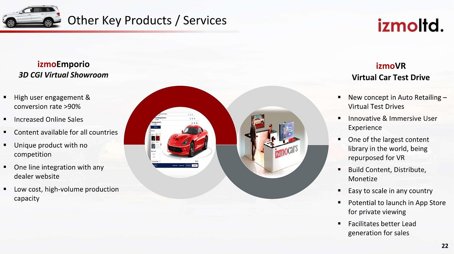 izmoweb Platform: A comprehensive platform that provides automotive retailers with fully functional, interactive online stores. This platform enables dealerships to showcase their inventory online, offer detailed car animations and graphics, and provide a rich customer experience.